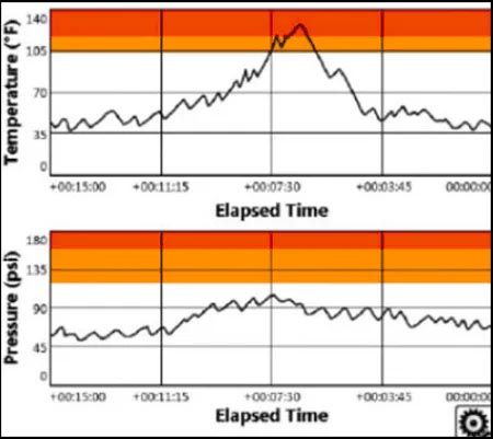 L’application Aurora Strip Chart vous permet de surveiller les données de température et de pression du fluide au fil du temps. Consulter ces données sur un graphique qui inclut les niveaux d’avertissement et critiques spécifiés dans les paramètres d’alarme du menu principal.